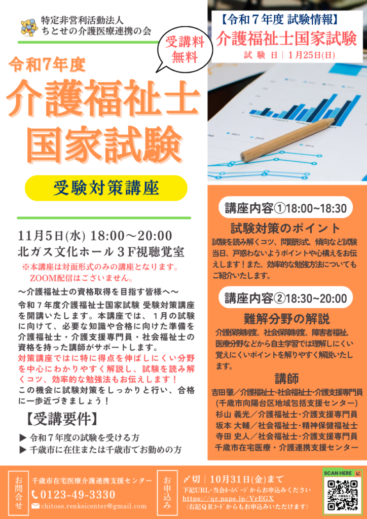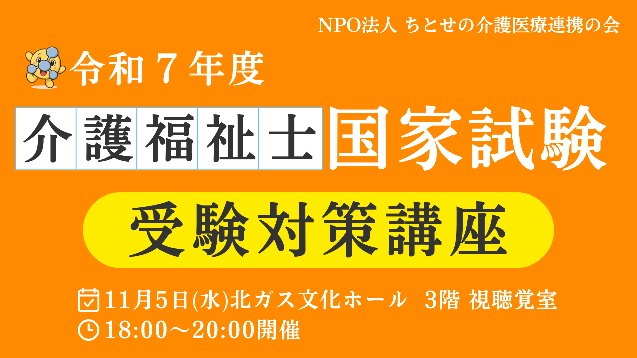 そんな皆さんの想いを応援するため、11月5日(水)18:00~20:00、北ガス文化ホールにて介護福祉士国家試験対策講座(無料)を開講します!