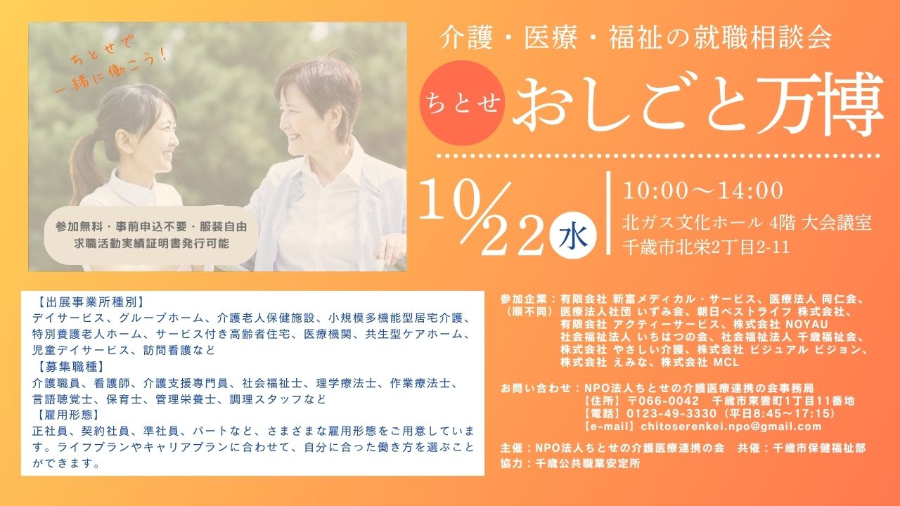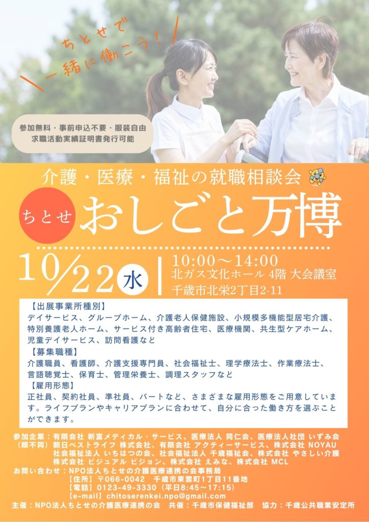 ちとせの介護医療連携の会・千歳市保健福祉部高齢者支援課では、千歳公共職業安定所(ハローワーク)のご協力のもと、介護・医療・福祉のお仕事に興味のある方を対象とした、就職相談会「おしごと万博」を開催いたします。