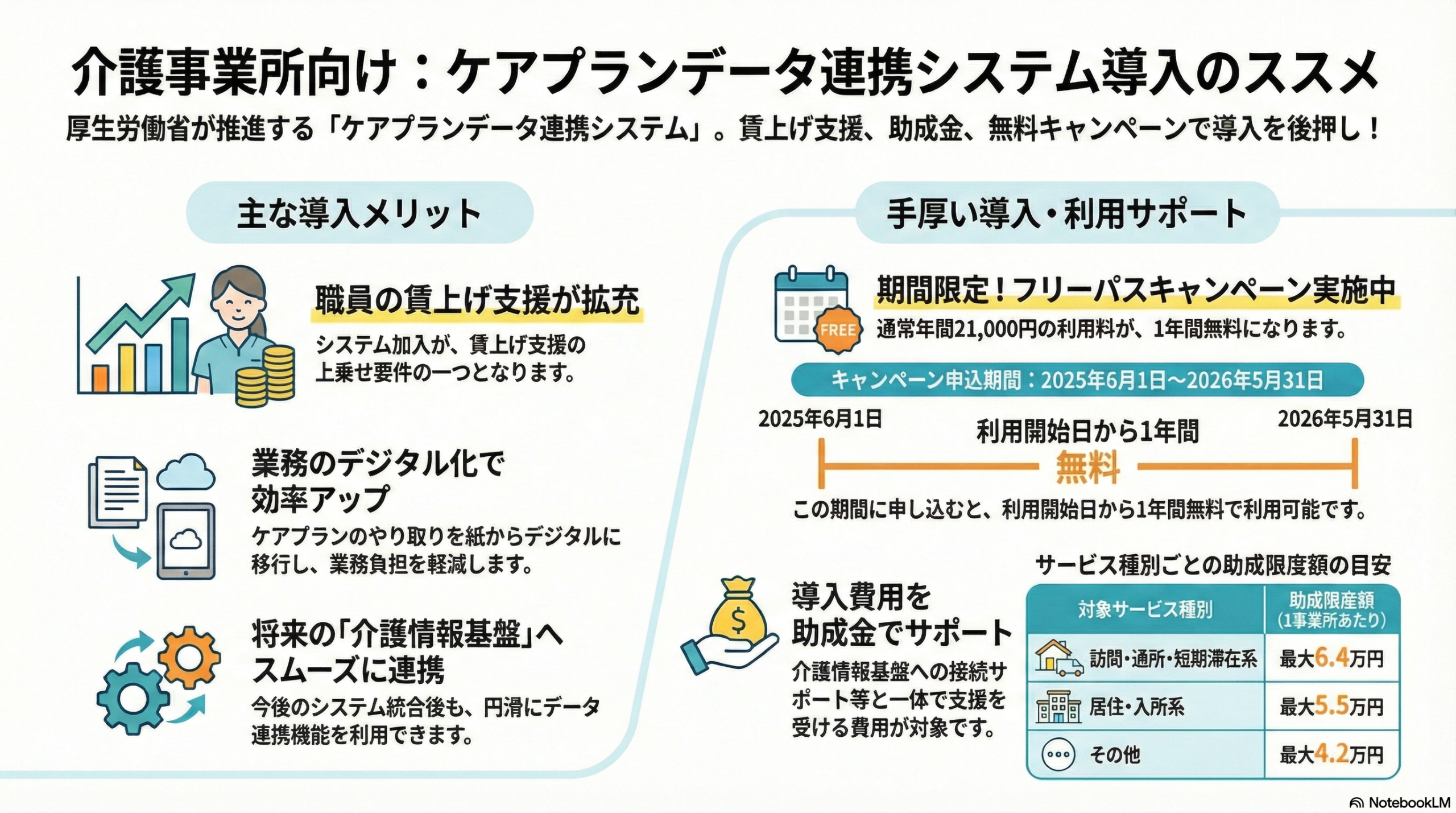 さらに、介護情報基盤とケアプランデータ連携システムの接続サポートを一体的に受ける場合、その費用も助成の対象となります。