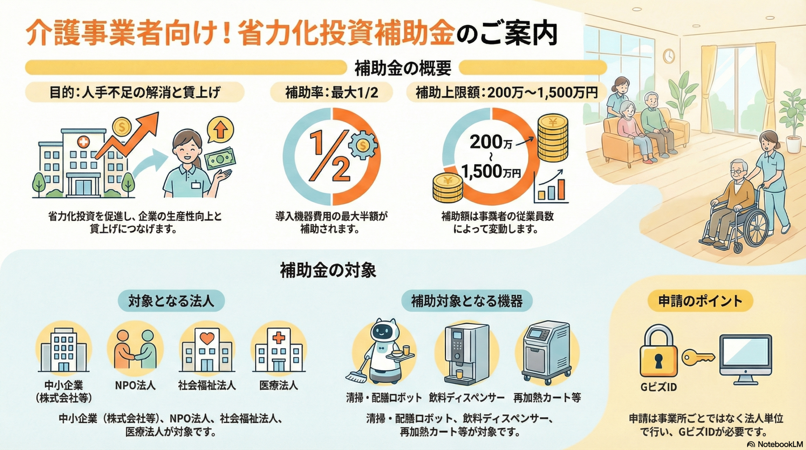 いわば**「介護現場の省力化のためのカタログショッピング支援」**といえる制度で、導入費用の負担を大幅に軽減できます。